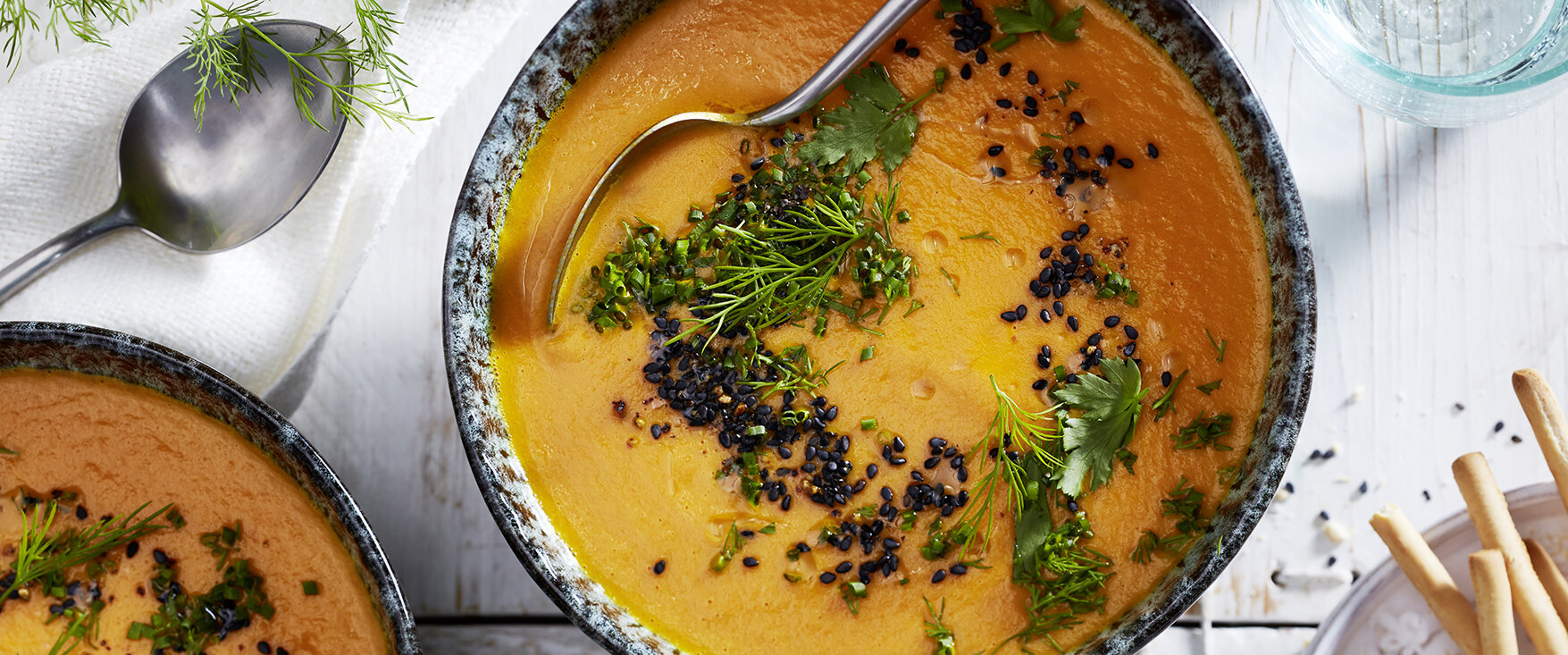 Kürbis-Möhrensuppe mit frischem Ingwer.